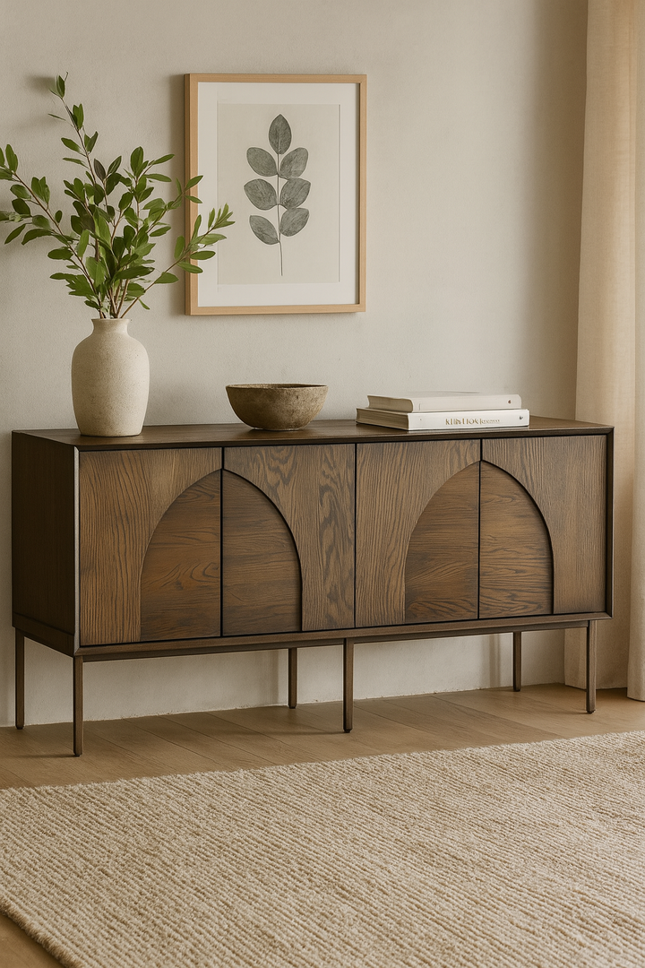 Striking a balance between minimalist structure and artistic expression, the Credenza Buffet Console is a bold statement in contemporary furniture design. Crafted from richly grained wood, this console features a symmetrical facade with carved arch motifs that add depth, texture, and a hint of architectural influence.