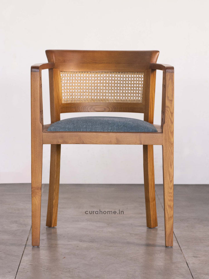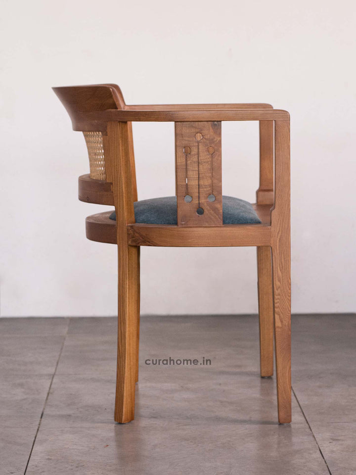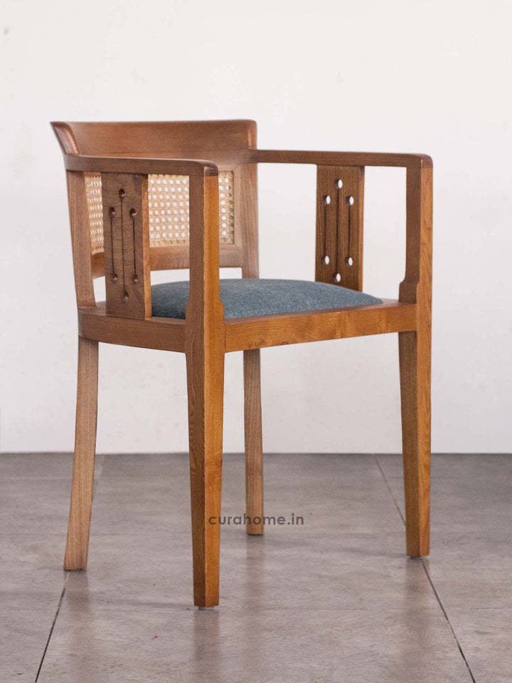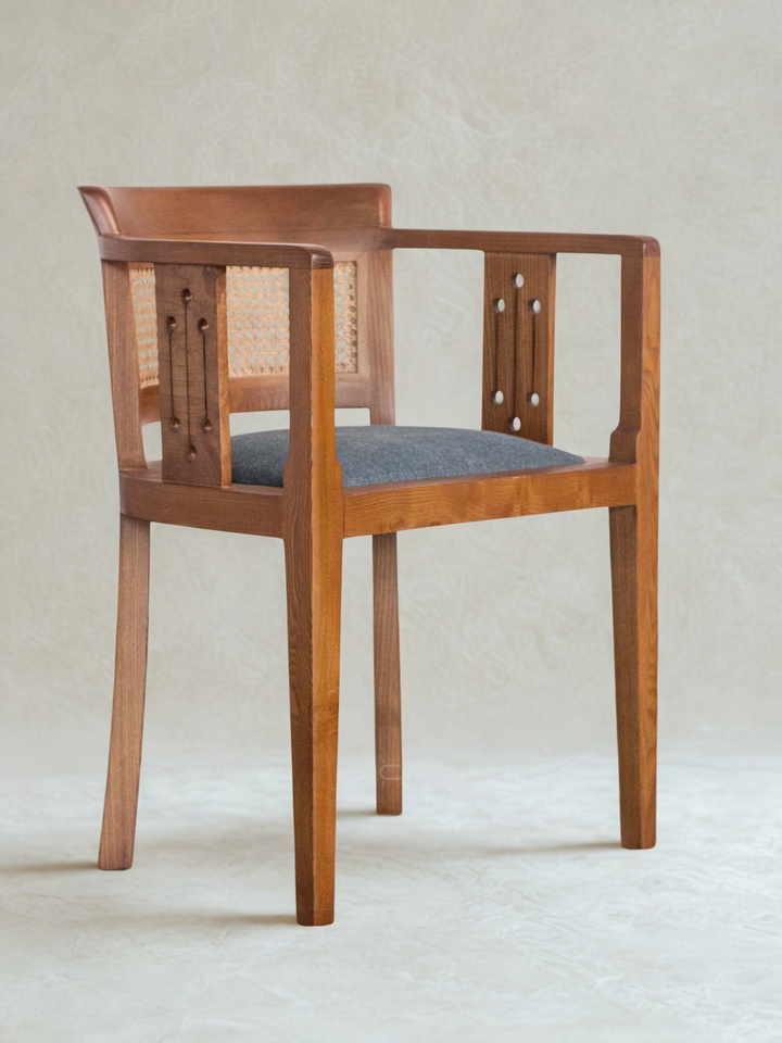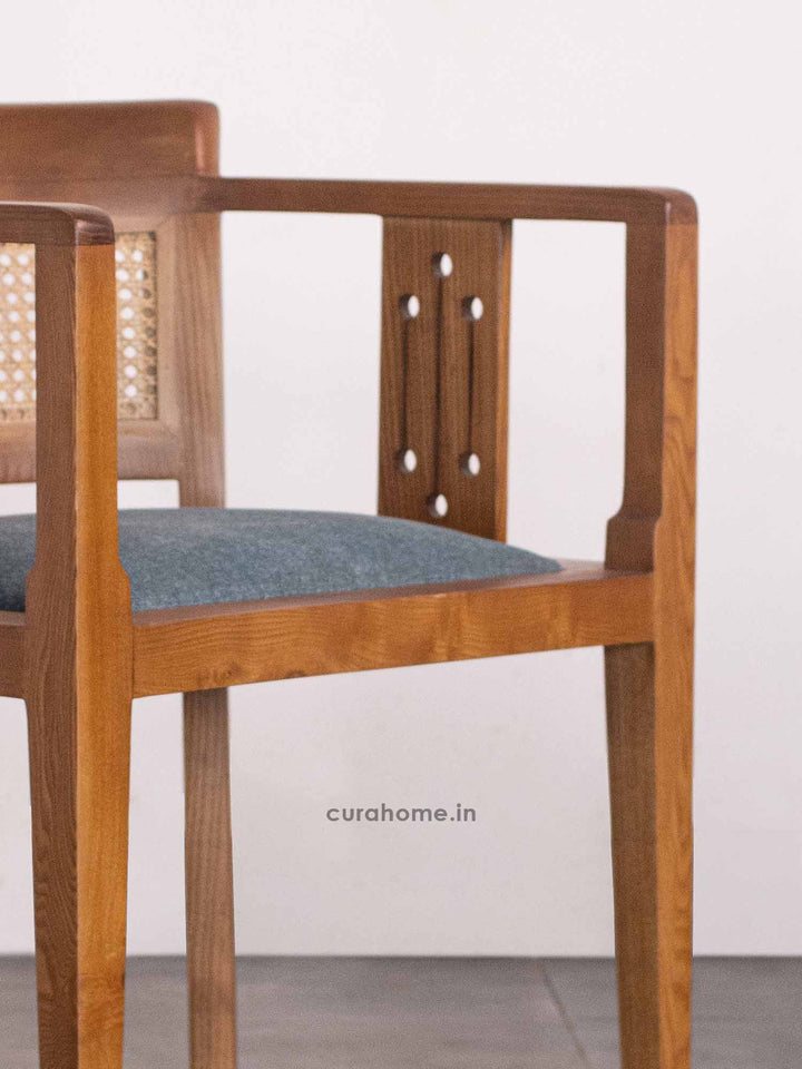 The Harbor Dining Chair by CURA HOME is a handcrafted designer piece that blends traditional artistry with modern aesthetics. Made from solid ash wood, it features an intricately detailed backrest with natural hand-woven cane and precision-cut perforations—showcasing premium craftsmanship. The flared back and clean, angular arms ensure ergonomic comfort and visual harmony. Upholstered in breathable premium fabric over high-resilience foam, this luxury chair is ideal for dining areas, reading nooks, or stylish workspaces in modern or classic interiors.