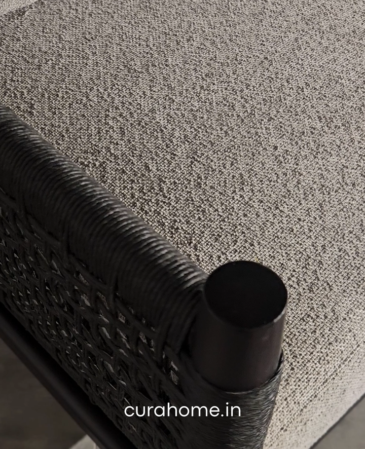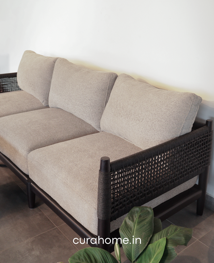 The frame is accentuated by handwoven Danish cord made from bamboo pulp, offering a perfect balance of texture and craftsmanship. Its generously cushioned seating in neutral stone-grey tones creates a striking contrast against the rich wood, ensuring both comfort and visual depth.