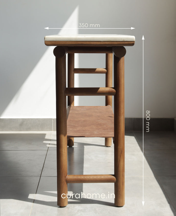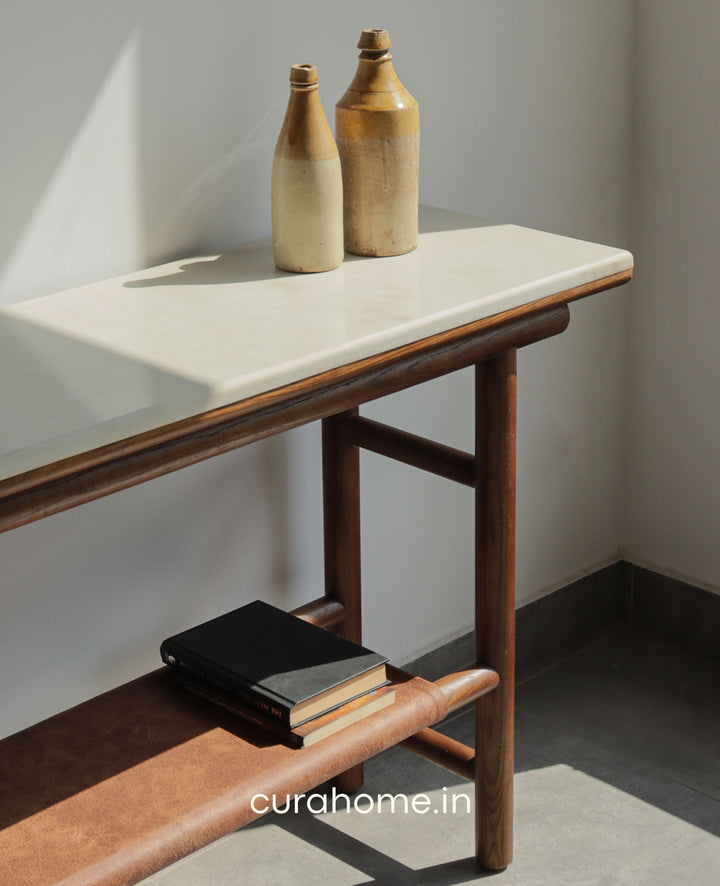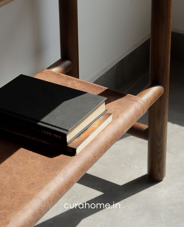 The lower shelf is upholstered with leatherette, providing subtle softness and utility. This thoughtful detail not only adds functionality but also elevates the tactile experience.