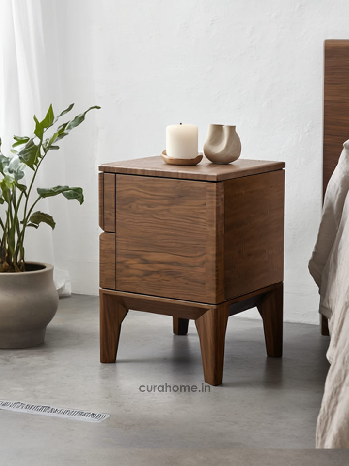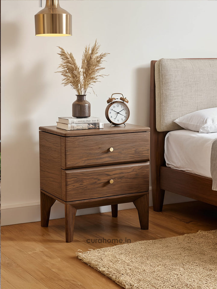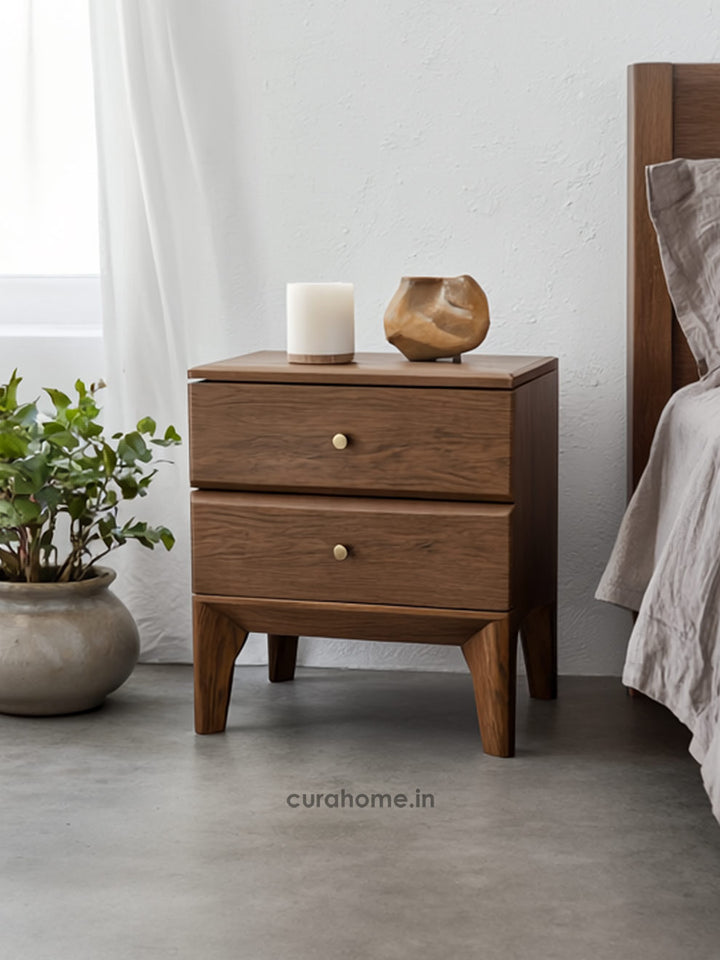 The Mellow Side Table blends soft curves with a clean, minimalist silhouette. Crafted from solid wood with a warm, natural finish, it features two smoothly contoured drawers with sleek brass knobs, offering ample bedside storage. The gently rounded edges and tapered legs give it a refined yet approachable presence, perfect for modern, Scandinavian, or Japandi-inspired spaces. Whether placed beside a bed or sofa, the Mellow Side Table adds a touch of quiet elegance and functional charm to your home