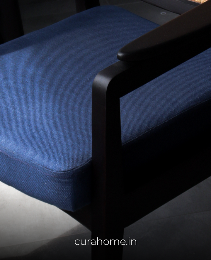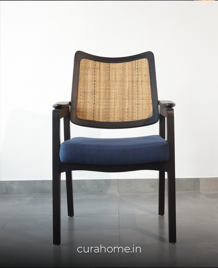 Its handwoven cane backrest breathes warmth into every space, while the deep indigo seat cushion offers comfort wrapped in sophistication. Framed in solid wood with clean lines, the Midori Chair is more than seating—it is a reflection of calm living, crafted for homes that value both beauty and meaning.