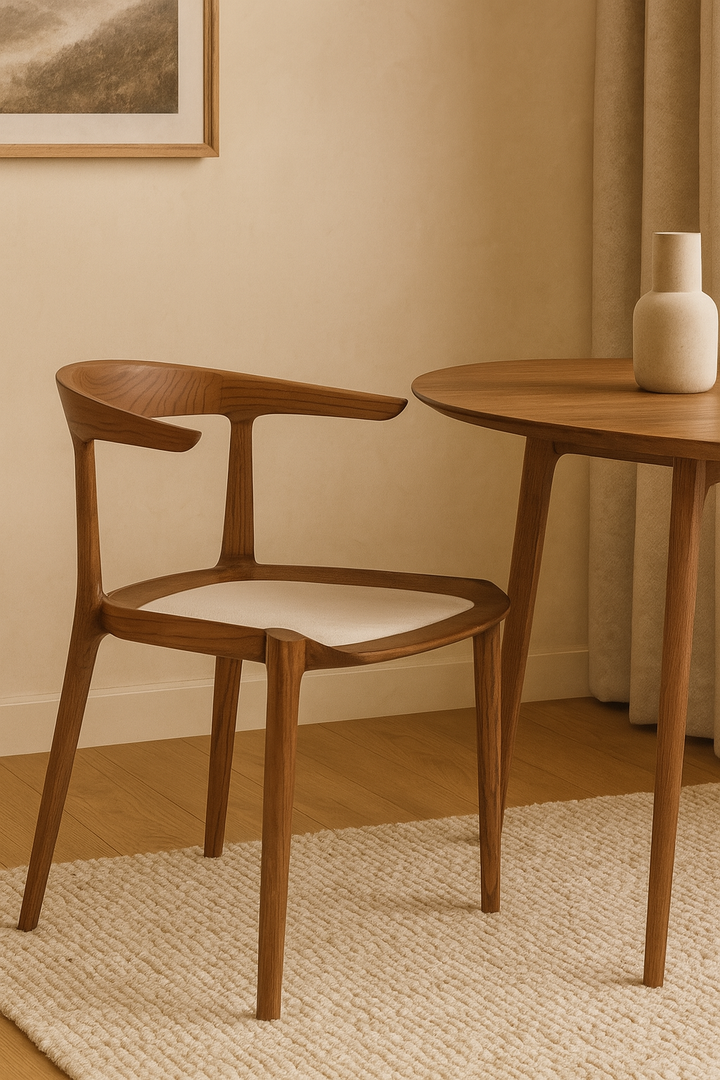 The Miller Dining Chair is a masterfully crafted piece that blends elegance, comfort, and structural precision. Made from solid wood with a smooth, curved backrest and organically flowing armrests, it offers ergonomic support while making a bold aesthetic statement. The chair features a gently upholstered seat cushion in a neutral fabric, perfectly complementing the rich tones and visible grain of the timber. Its design is minimalist yet sculptural, with seamless joinery and refined detailing that highlight the craftsmanship. The chair's lightweight form and balanced proportions make it suitable for both dining and accent seating, exuding sophistication in any modern interior.