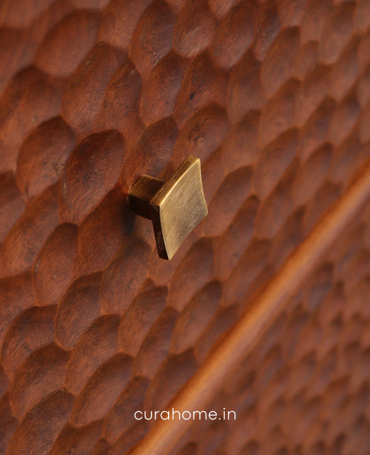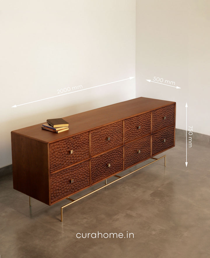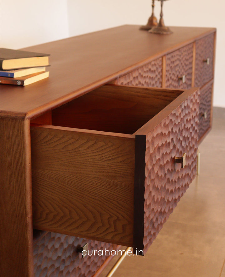 Crafted from rich ash wood, the Oliver Console Table combines modern elegance with artisanal detail. Its chiselled drawer fronts create a striking texture that catches light beautifully, while the sleek brass handles add a refined touch of luxury. Supported by a minimal black metal base, this piece offers generous storage across multiple drawers — perfect for organizing essentials while enhancing your space with timeless charm.
