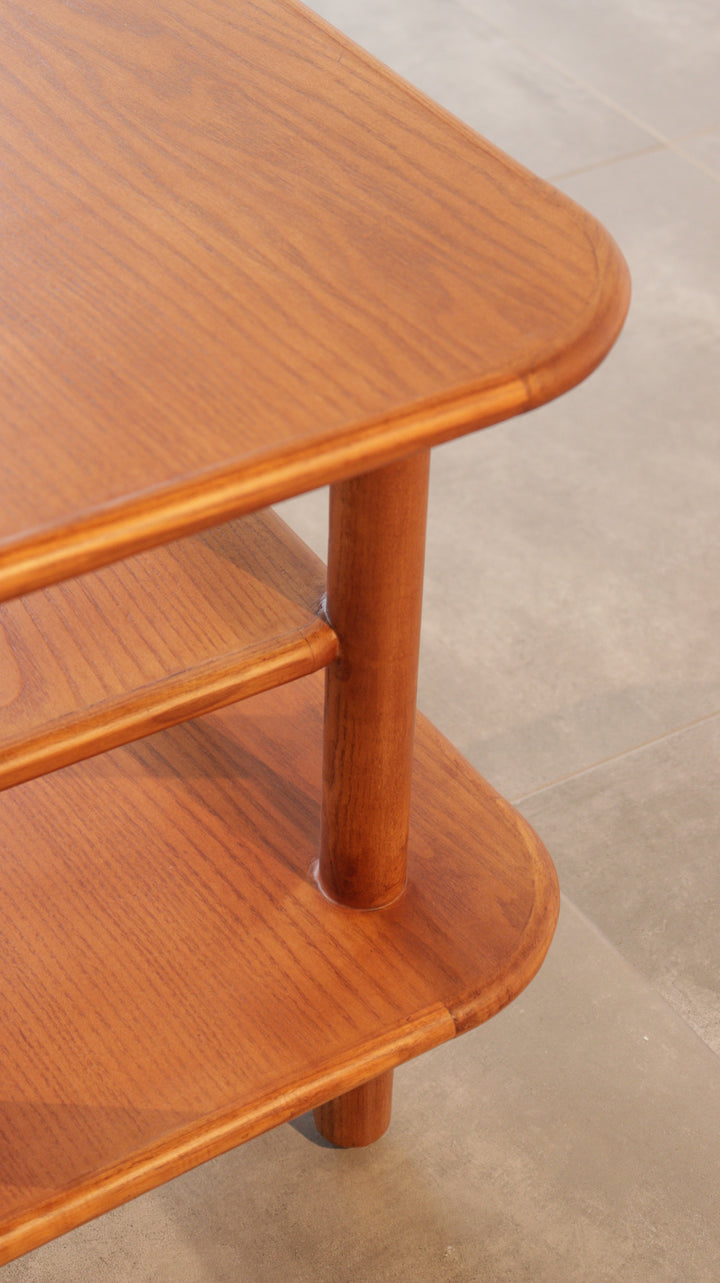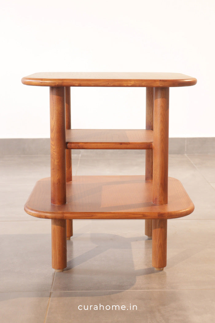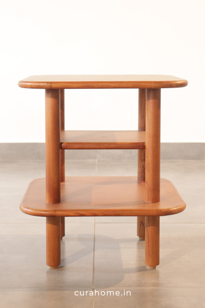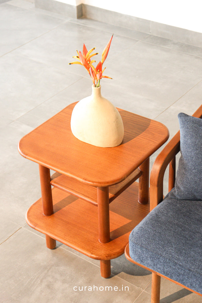 Orbita End Table – A versatile designer side table crafted in premium solid wood with smooth rounded edges and a dual-shelf design. Perfect as a modern living room accent, this handcrafted end table blends functionality with timeless minimalism, offering space for décor, books, or everyday essentials. Ideal for contemporary, Japandi, and modern Indian interiors.