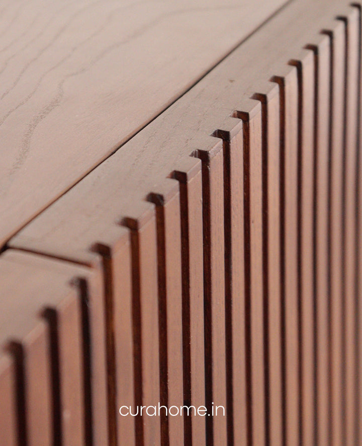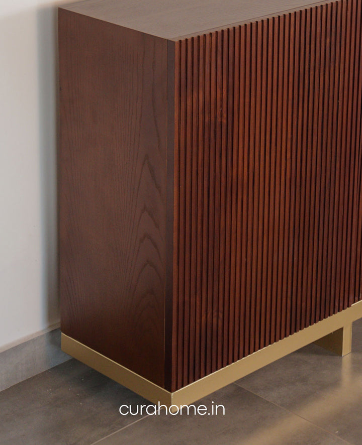 The Remus Console Table is crafted from premium ashwood, showcasing an elegant fluted façade that adds texture and depth to any space. Its sleek brass-finish base elevates the design with a modern, luxurious touch. Equipped with four spacious storage compartments, Remus offers generous hidden storage while maintaining a clean, minimalist silhouette. Perfect for entryways, living rooms, or dining areas, it blends functional elegance with timeless craftsmanship.