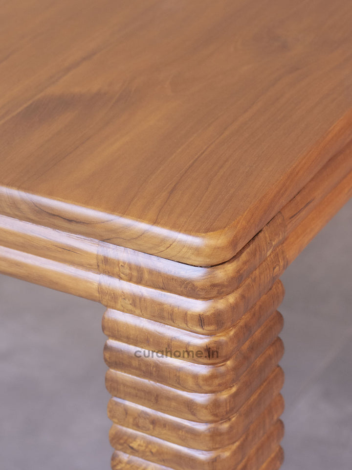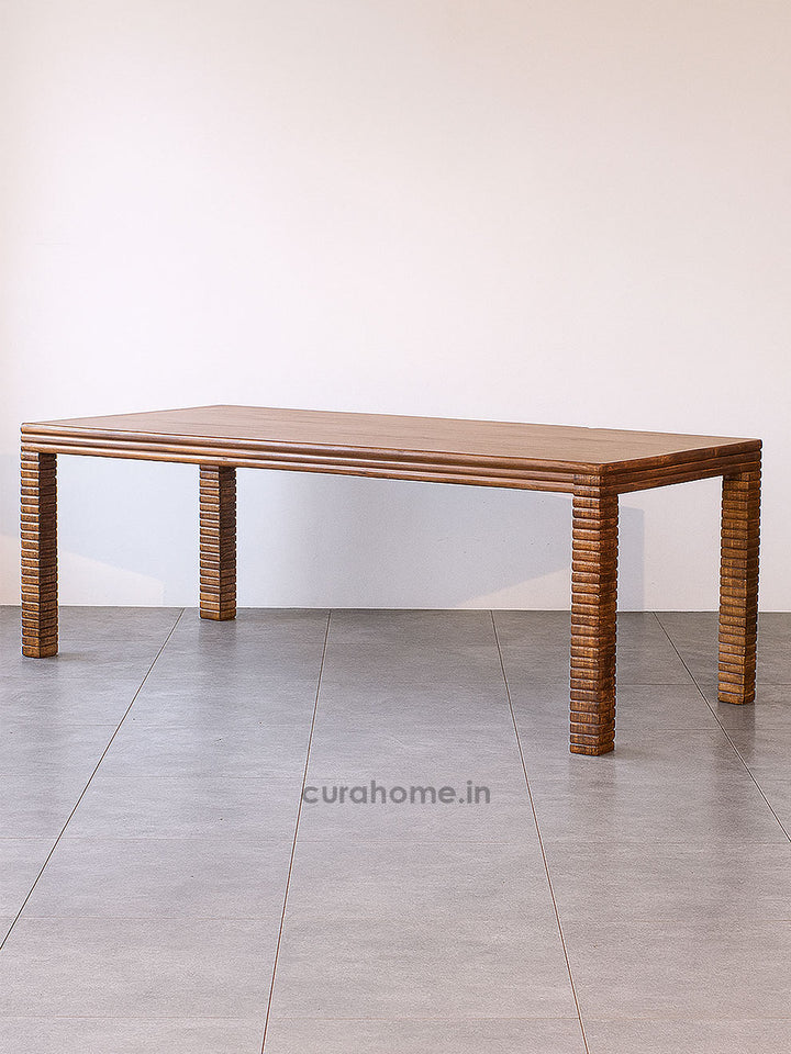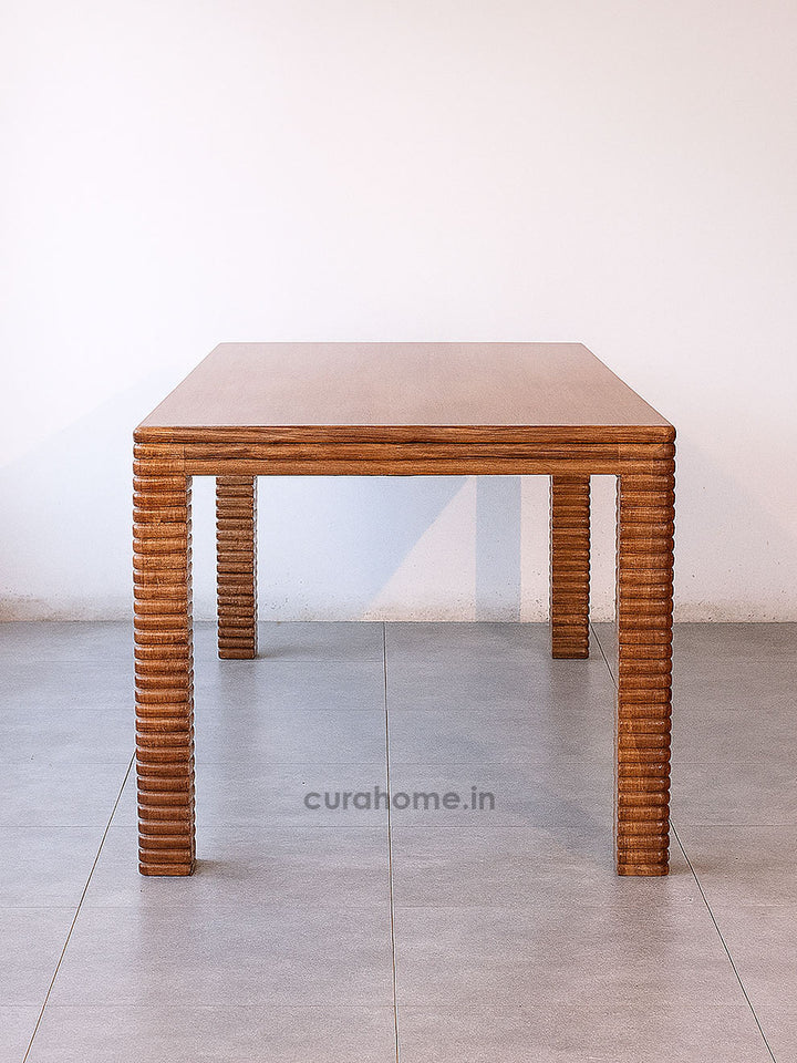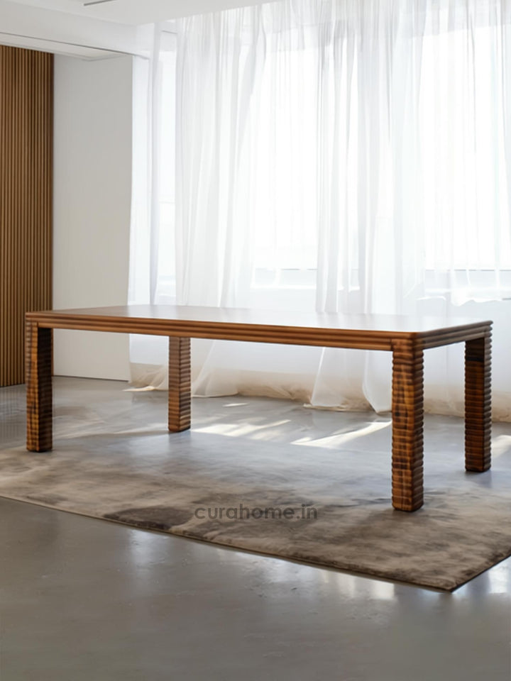 The Ripple Dining Table is a striking blend of modern minimalism and intricate craftsmanship. Its defining feature is the unique ripple-textured detailing that flows seamlessly across the legs and table edges, adding depth and sophistication to its clean silhouette. Crafted from premium wood and finished in a rich walnut tone, the table exudes warmth while maintaining a sleek, contemporary appeal. The spacious rectangular top offers ample room for gatherings, making it ideal for both everyday dining and elegant entertaining. Perfect for modern interiors that value design, function, and timeless style.