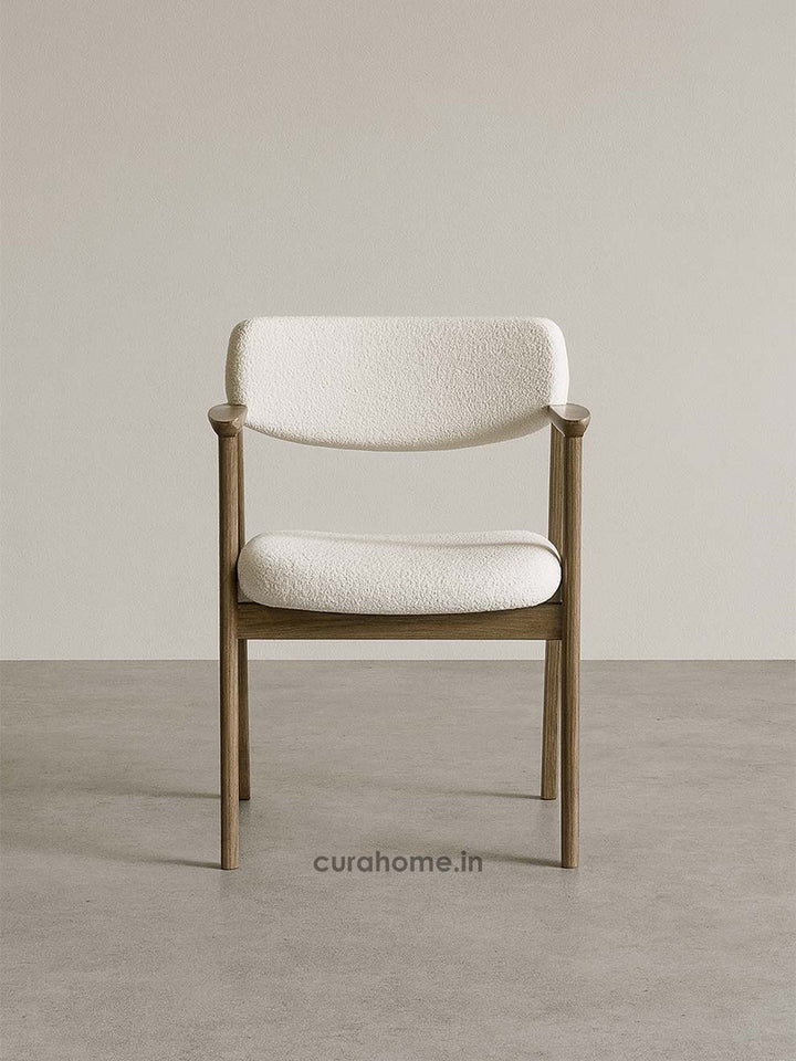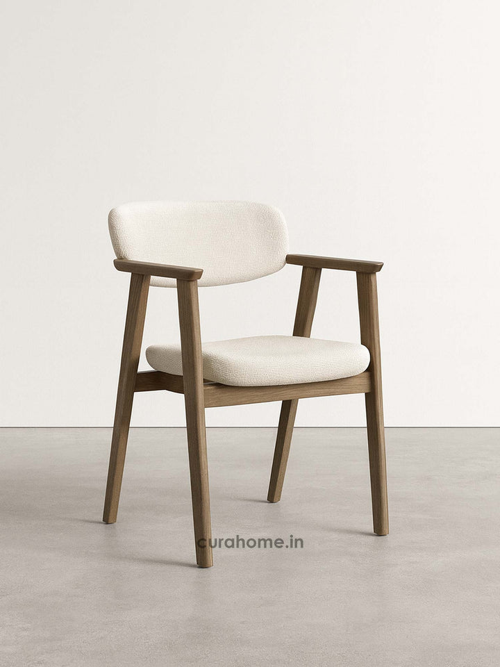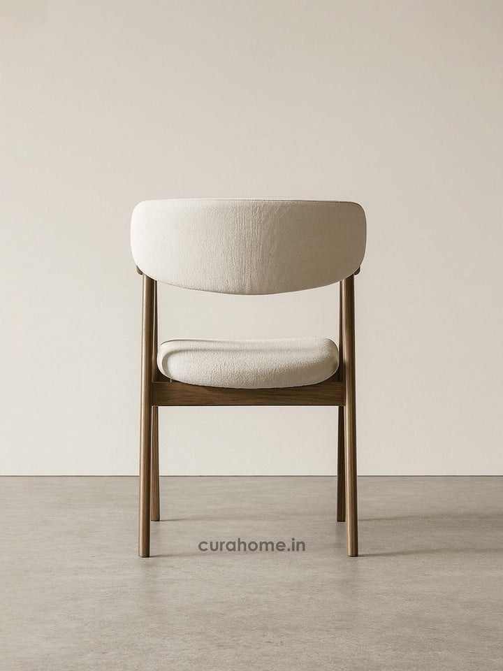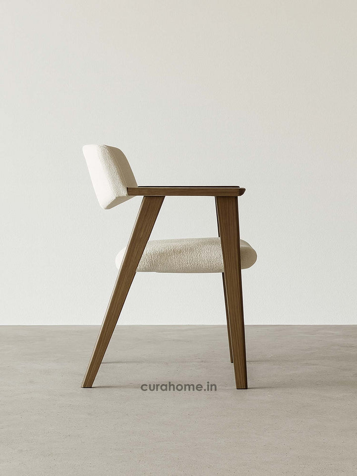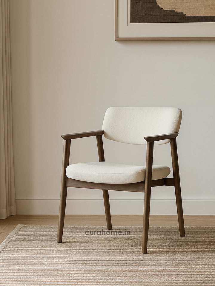 Inspired by timeless mid-century aesthetics, the Rumi Dining Chair blends elegant form with everyday comfort. Handcrafted from solid wood in a warm walnut finish, it features a gently curved backrest and plush cushioned seat upholstered in soft, textured off-white fabric. The sculpted armrests and tapered legs add a refined touch, making it a versatile addition to dining spaces, reading nooks, or contemporary work settings. Minimalist, durable, and effortlessly stylish—the Rumi is designed to stand out while blending in.